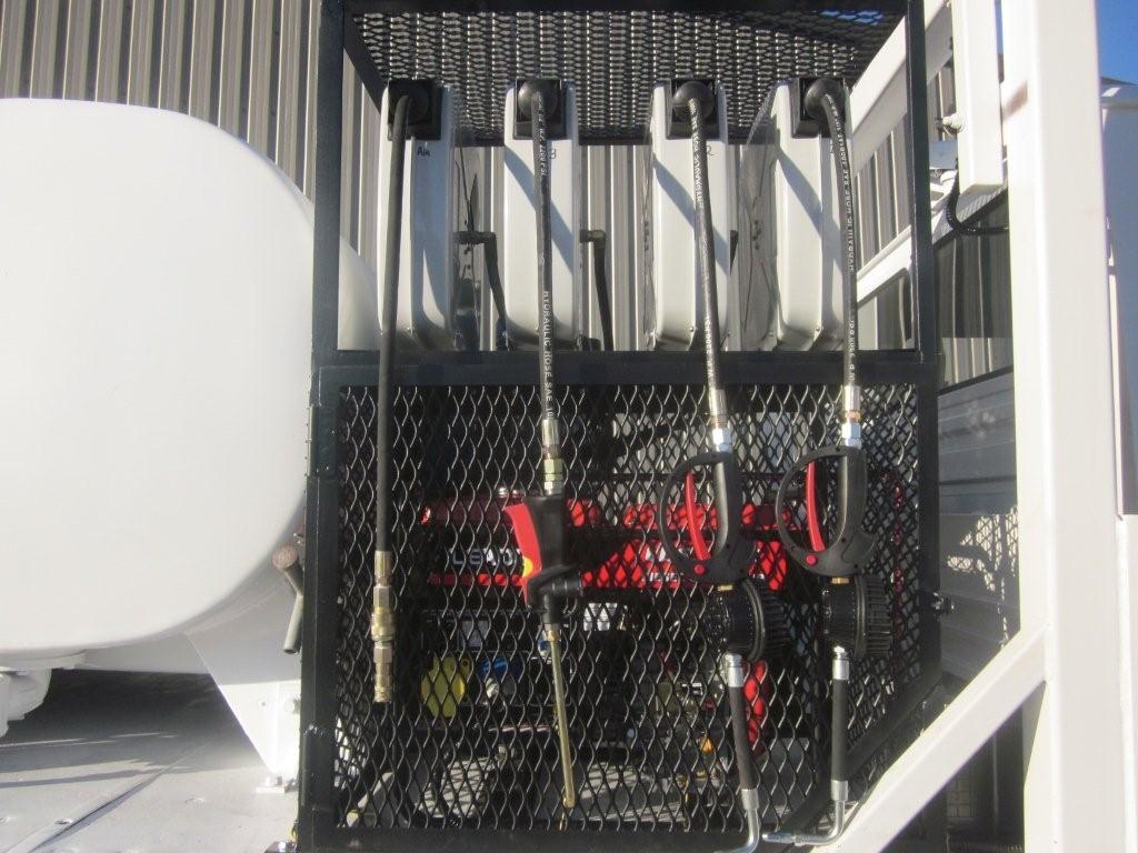 3x 205 litre drums for engine oil, hydraulic oil and gear oil fitted with air operated pumps and retractable hose reels.