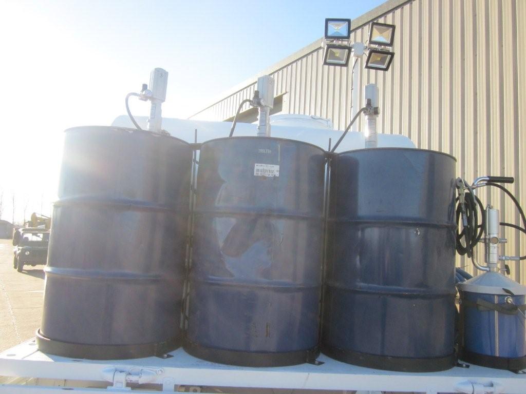3x 205 litre drums for engine oil, hydraulic oil and gear oil fitted with air operated pumps and retractable hose reels.
