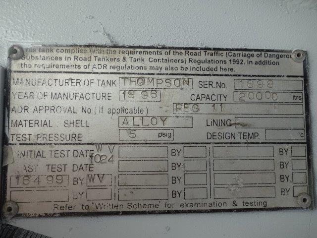 The unit comprises of a Mercedes 4x2 tractor unit coupled with a fixed turn table thompson 20,000 litre 4 compartment alloy tank on a multidrive chassis with rear steering bogie.