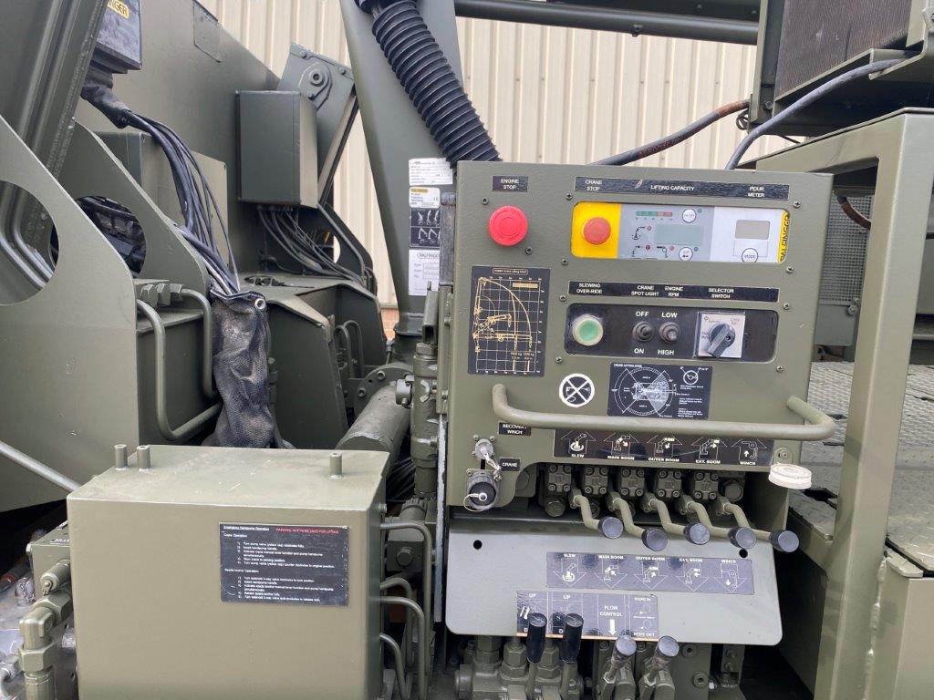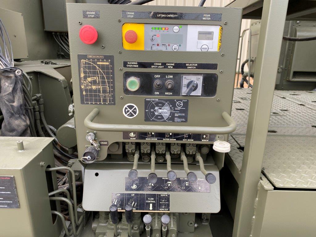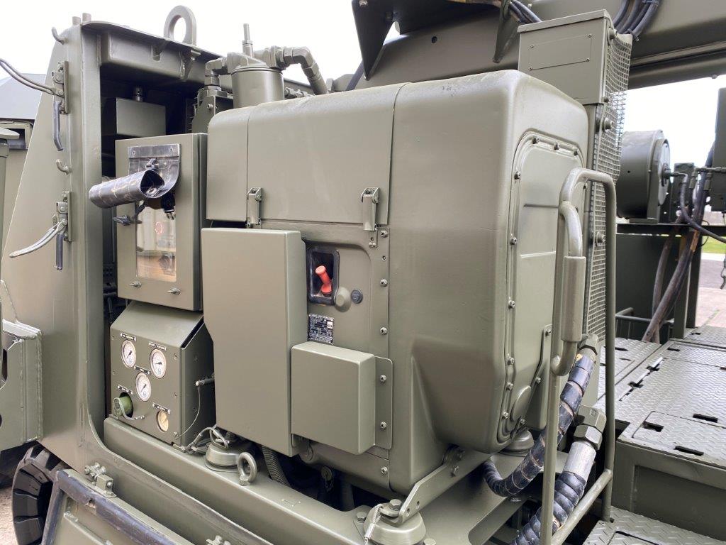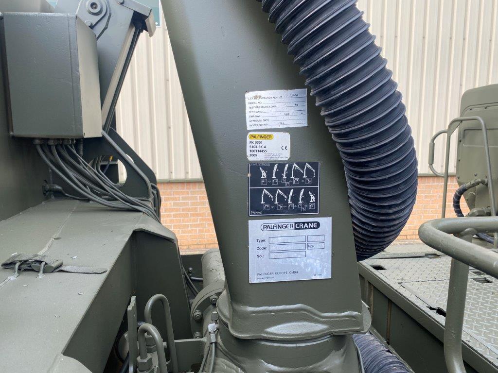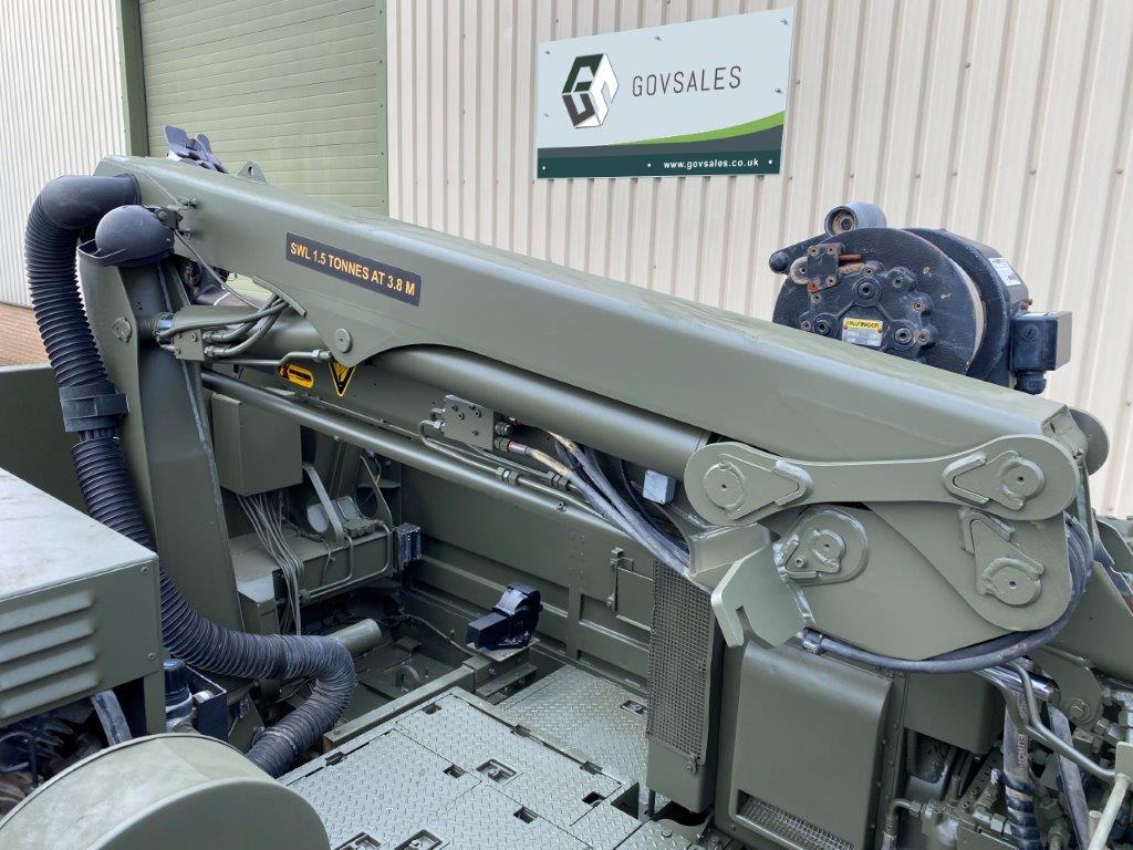 Onboard equipment on the flatbed consists of a Palfinger 6mT crane mounted on a subframe. The RRV is also equipped with a constant pull winch which is capable of providing a maximum 10T pulling force. The subframe carries a pair of anchor spades which help to support the vehicle during lifting or winching operations. A 23 CFM air compressor with 2 hose reels is also provided to allow power tools to be used. Finally a workbench and vice unit and storage units are carried to facilitate maintenance tasks to be carried out.